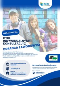 Burmistrz Miasta Redy we współpracy z Powiatowym Urzędem Pracy w Wejherowie zapraszają uczniów klas 8 redzkich szkół podstawowych wraz z rodzicami/ opiekunami prawnymi  na indywidualne konsultacje z doradcą zawodowym. Spotkania będą odbywały się raz w miesiącu.