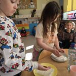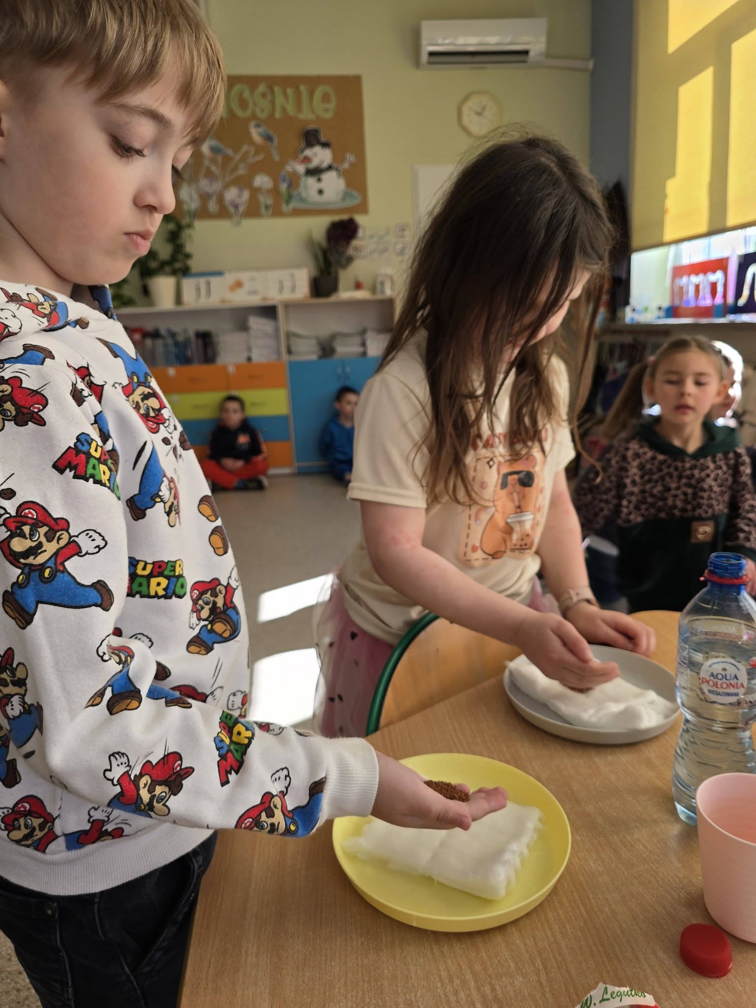 Grupa 0a aktywnie włączyła się w wykonywanie zadań w ramach Lidera Lokalnej Ekologii. Jednym z działań było wykonanie dwóch eksperymentów. Pierwszym z nich było doświadczenie „kwaśne deszcze”. Na dwóch talerzykach dzieci zasiały nasiona rzeżuchy. Nasiona z pierwszego talerzyka podlewane były wodą, nasiona z drugiego talerzyka podlewane były wodą z octem- miało to imitować kwaśne deszcze. Dzieci przez 9 dni obserwowały, co się dzieje i szybko zauważyły, że kwaśny deszcz uniemożliwia nasionom prawidłowy rozwój a wręcz spowodowało, że nasiona nie wyrosły.