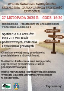 W imieniu Powiatowego Urzędu Pracy w Wejherowie zapraszamy uczniów klas 7 i 8 wraz z rodzicami na spotkanie, które odbędzie się Zespole Szkolno – Przedszkolnym w Choczewie, 27 listopada br., o godz. 16.30. Spotkanie będzie dotyczyło przedstawienia oferty szkół ponadpodstawowych. Młodzież będzie miała również okazję zapoznać się z charakterem pracy niektórych zawodów. Serdecznie zapraszamy!