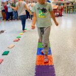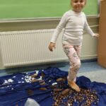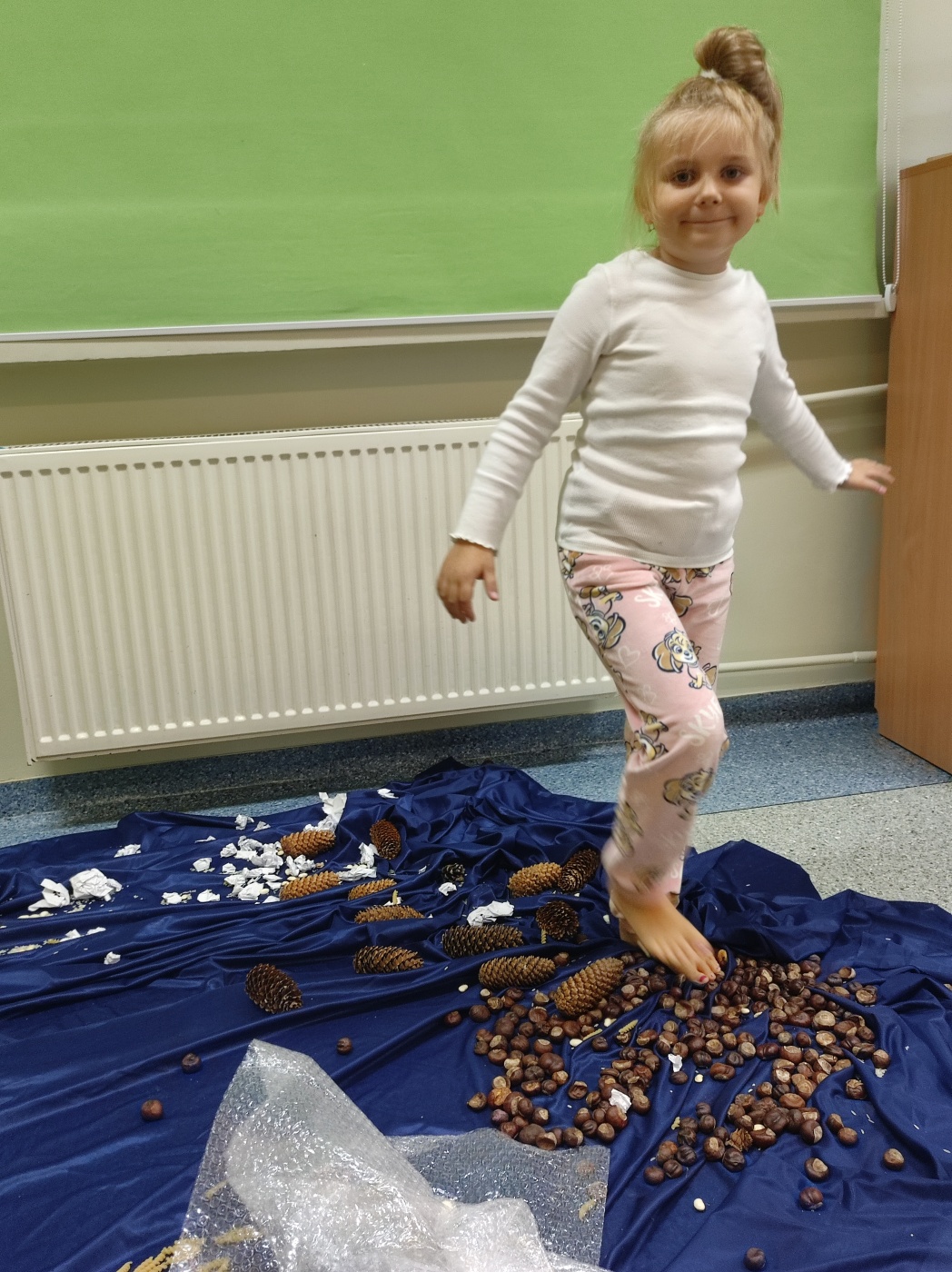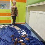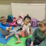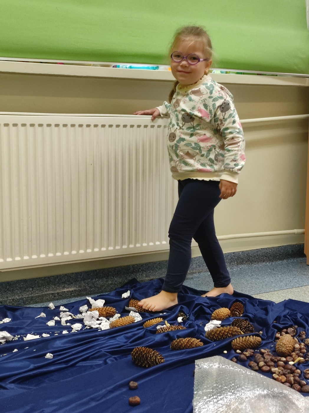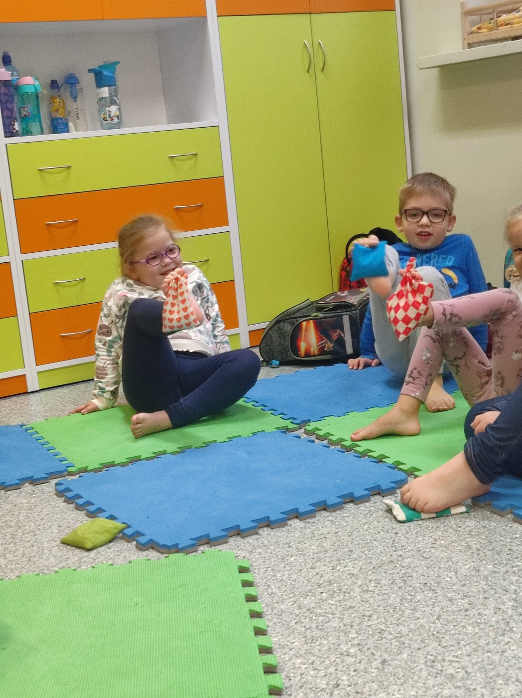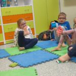 Tego dnia rozmawialiśmy o tym, jak ważne są dla nas nasze stopy, jak o nie dbać oraz jakie ćwiczenia wykonywać aby zdrowe służyły nam długie lata. Ćwiczenia zaczęliśmy od gimnastyki z woreczkami , następnie przeszliśmy po kółku sensorycznym oraz torze. Nie lada  wyzwaniem było odrysowanie własnej stopki ale poradziliśmy sobie z tym znakomicie.