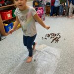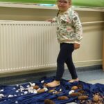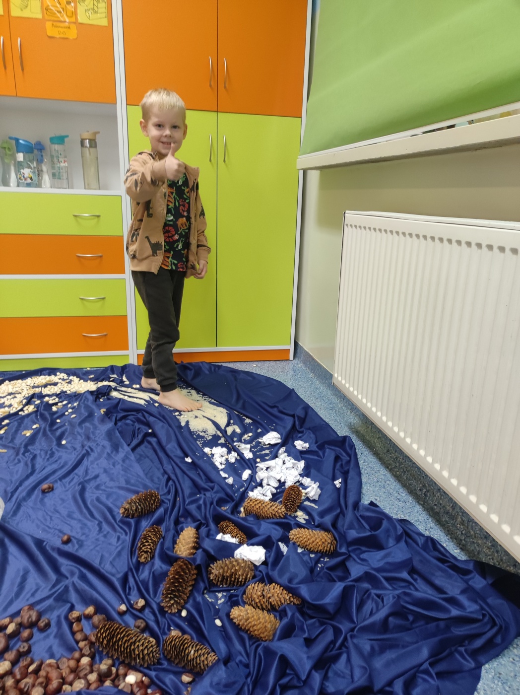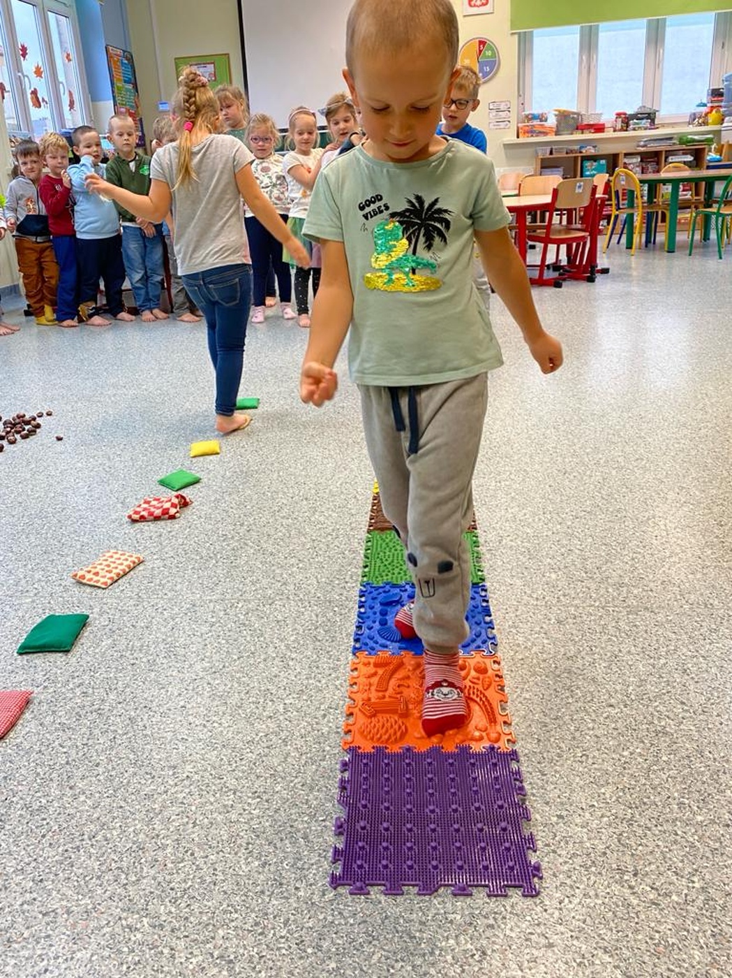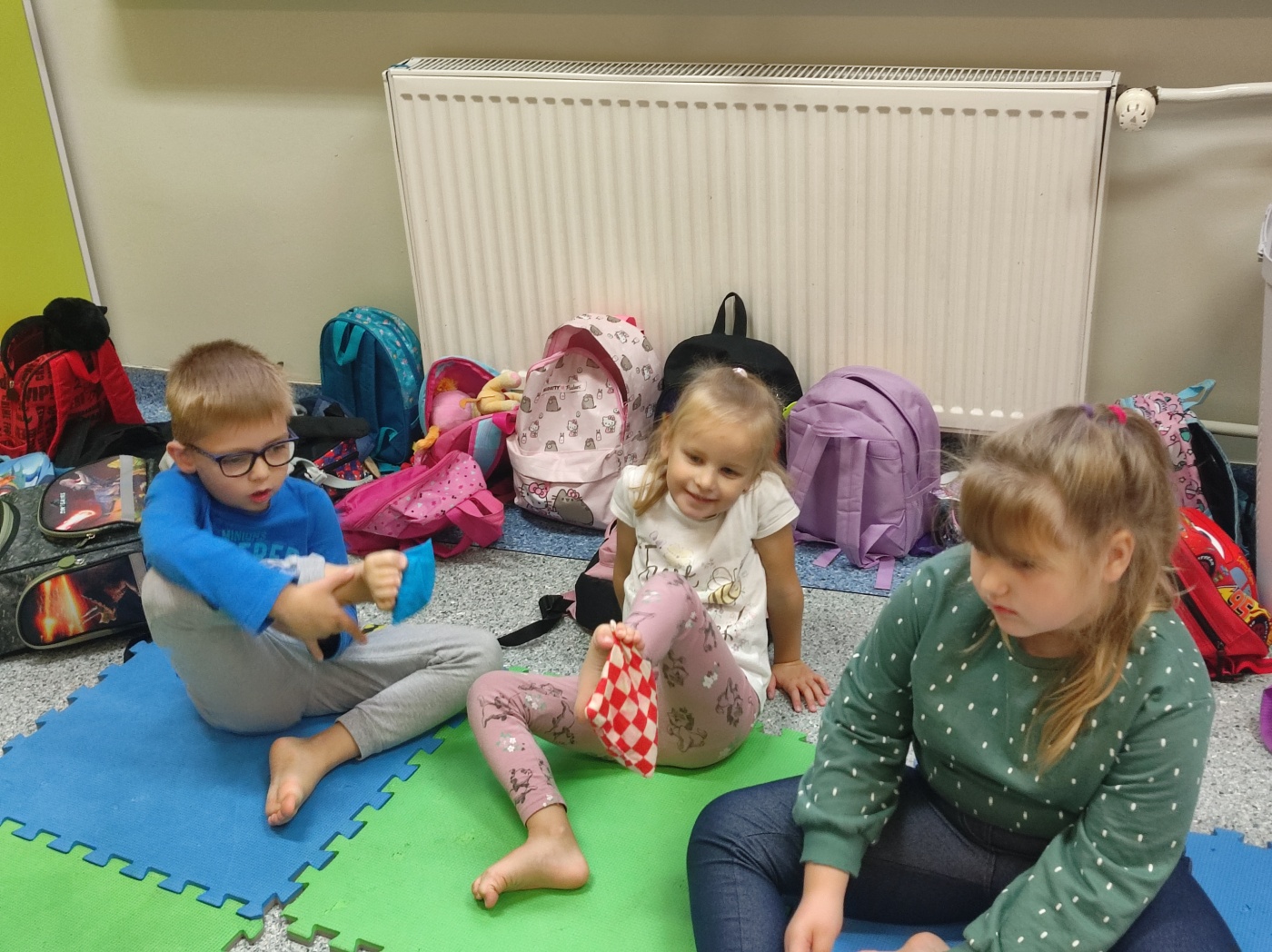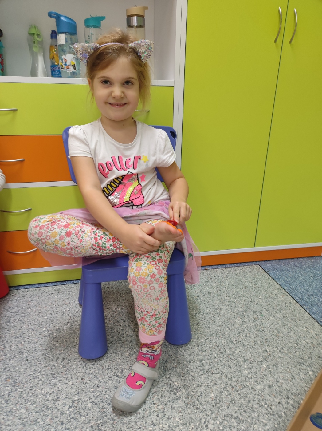 Tego dnia rozmawialiśmy o tym, jak ważne są dla nas nasze stopy, jak o nie dbać oraz jakie ćwiczenia wykonywać aby zdrowe służyły nam długie lata. Ćwiczenia zaczęliśmy od gimnastyki z woreczkami , następnie przeszliśmy po kółku sensorycznym oraz torze. Nie lada  wyzwaniem było odrysowanie własnej stopki ale poradziliśmy sobie z tym znakomicie.