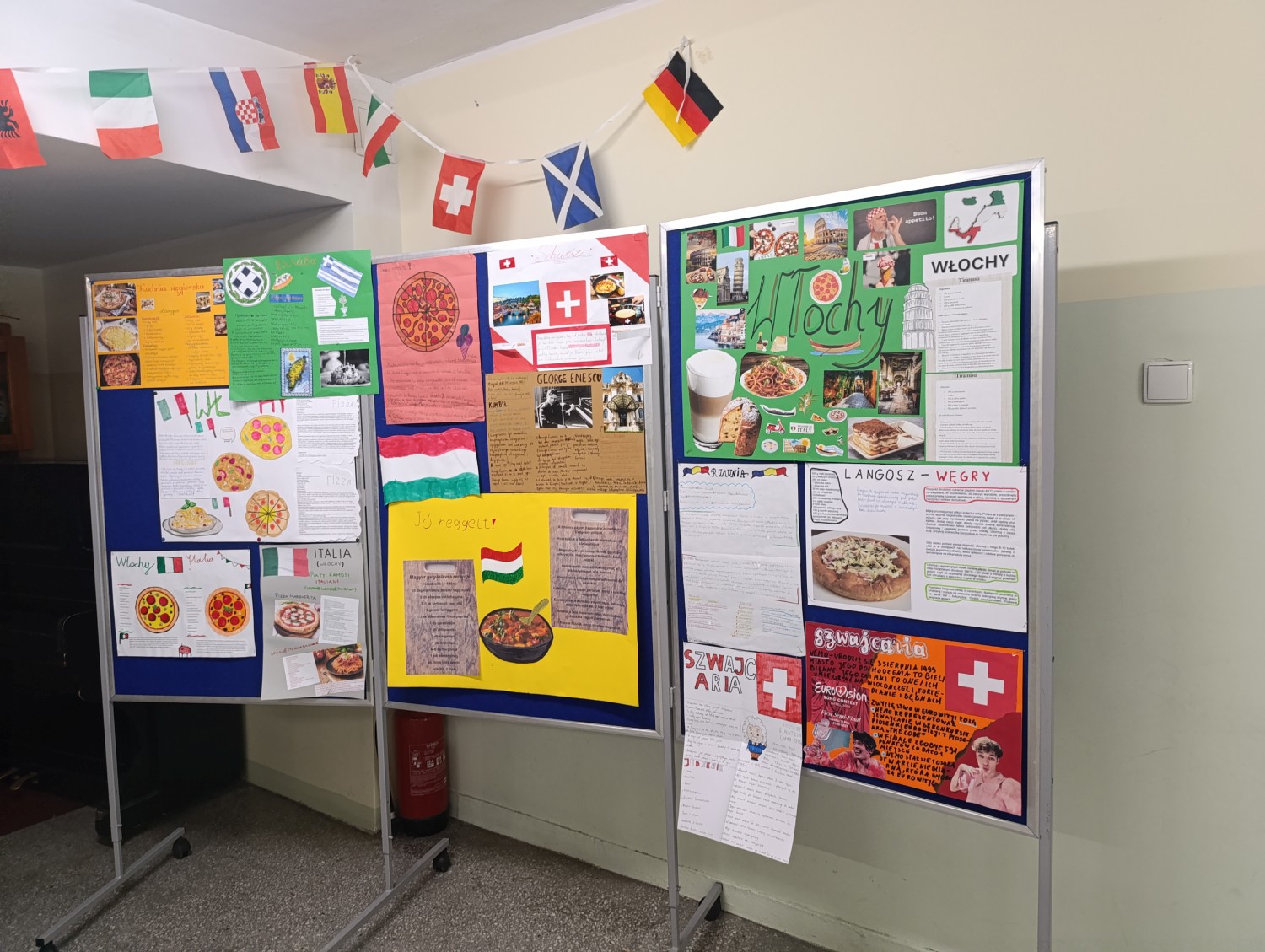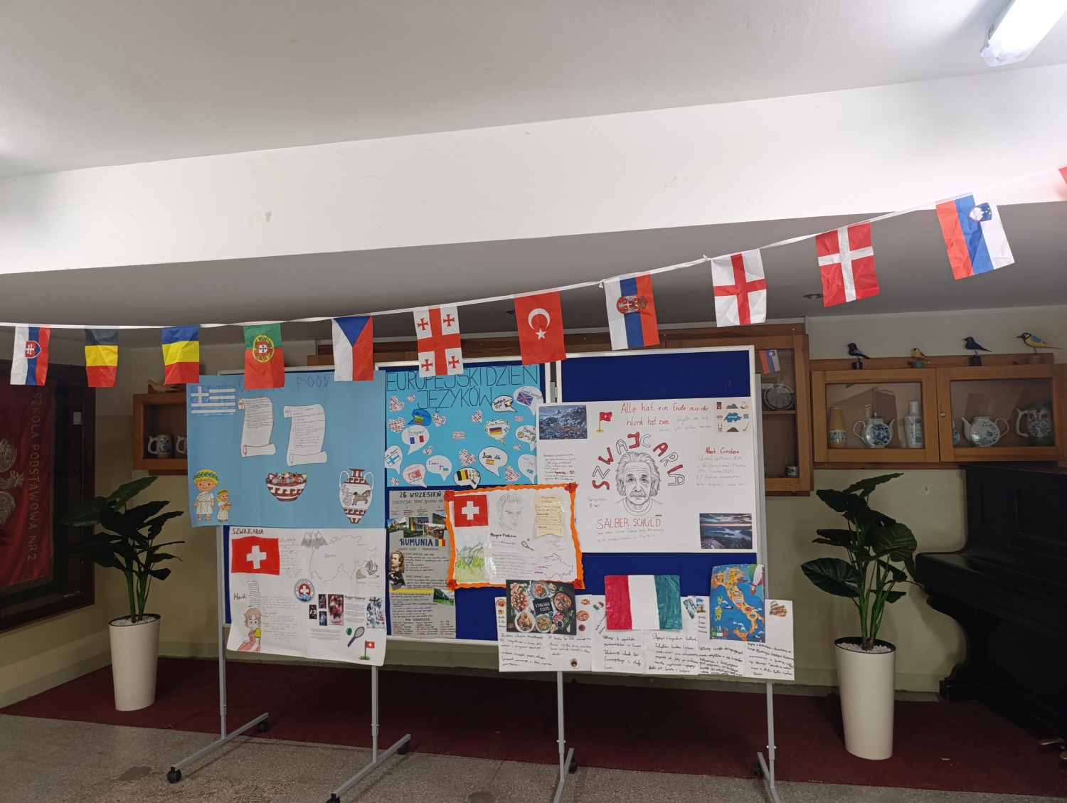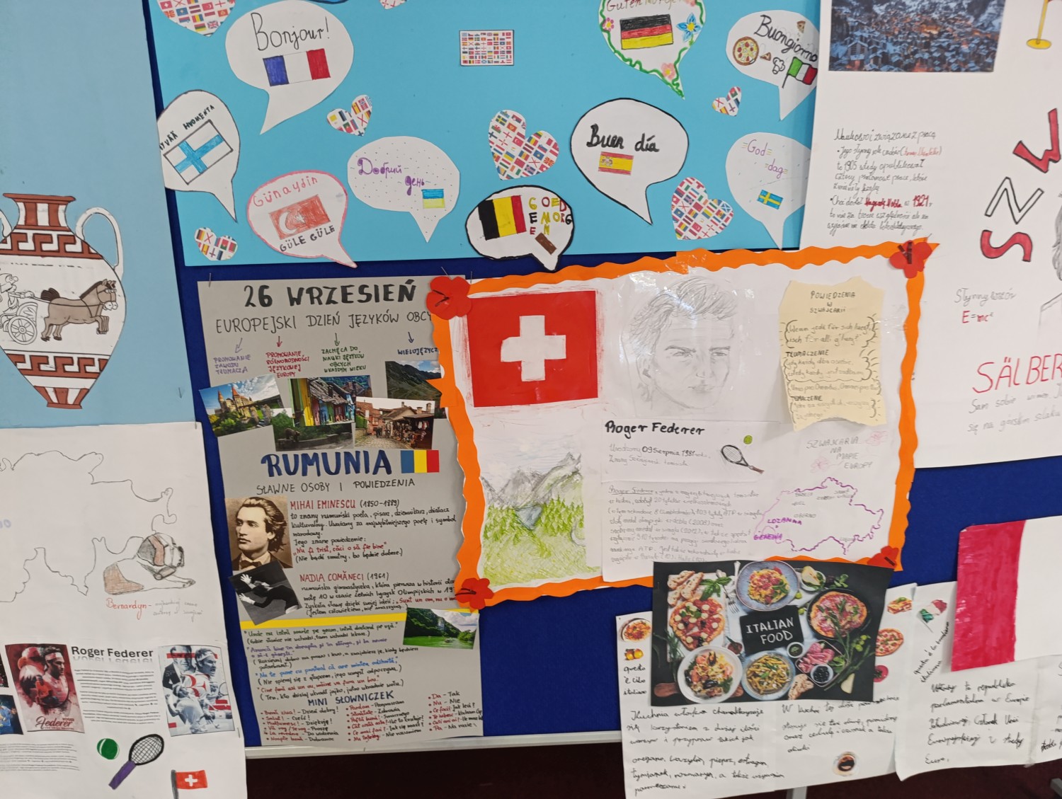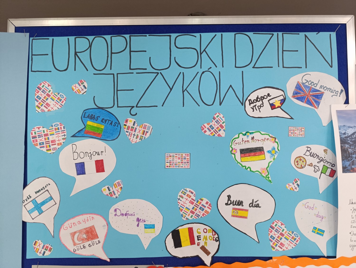 26 września świętowaliśmy w naszej szkole Dzień Języków Europejskich. Uczniowie klas młodszych przygotowali flagi wylosowanego kraju, ubrali się w jego barwy, a nawet przygotowali drobne smakołyki. Klasy starsze przygotowały plakaty ukazujące przepisy kulinarne oraz tradycyjne dania krajów europejskich. Nie zabrakło także quizów oraz ciekawostek dotyczących kultury i tradycji różnych państw.