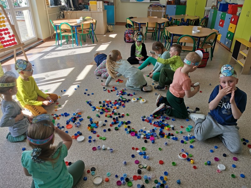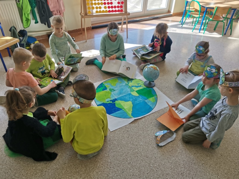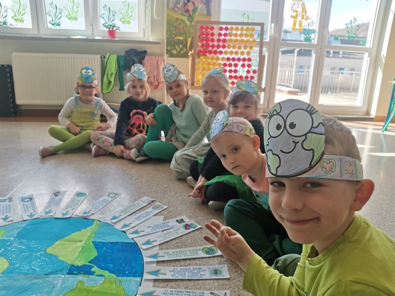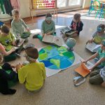 Oglądaliśmy filmy o tematyce ekologicznej. Widzieliśmy na ekranie wielką wyspę śmieci na Pacyfiku, która nas i zadziwiła i zasmuciła. Czytaliśmy książki o drzewach i ochronie przyrody. Wykonywaliśmy prace plastyczne. Stworzyliśmy ogromny plakat z Ziemią – to nasza wspólna, grupowa praca. Czytaliśmy przeróżne ciekawostki, niektóre znaliśmy a inne były dla nas totalnym zaskoczeniem. Stworzyliśmy własnoręcznie opaski na głowy. Dużo rozmawialiśmy – okazało się, że grupa 0c to mali strażnicy przyrody 🙂
