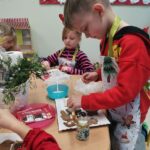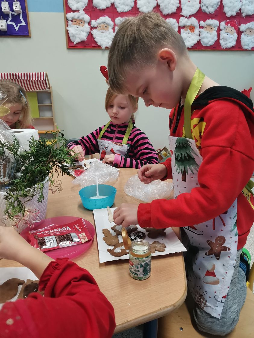 Główną atrakcją Mikołajek były warsztaty piernikowe- każdy przedszkolak ubrany w specjalny świąteczny fartuszek ozdobił swoje własne pierniczki, zbudował dla nich chatkę i pięknie je zapakował, by następnie zabrać wszystko do domu.