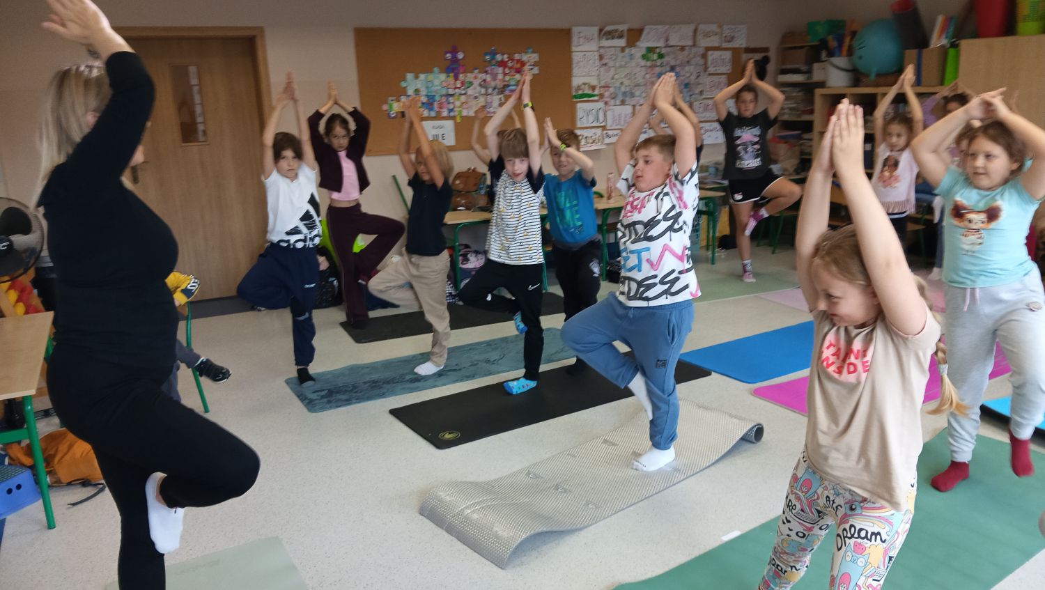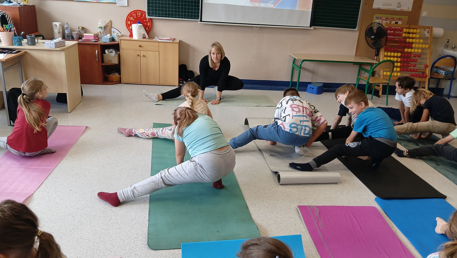 W poniedziałek 29 września w klasie 3a odbyła się nietypowa lekcja języka angielskiego. Według instrukcji wydawanych w języku angielskim dzieci ćwiczyły na matach pozycje zaczerpnięte z yogi nawiązujące do świata zwierząt i natury. Uczniowie przekonali się, ze nie jest łatwo stać dłuższą chwilę na jednej nodze w pozycji drzewa lub utrzymać proste plecy w pozycji motyla, dotykając jednocześnie kolanami podłogi w siadzie skrzyżnym.