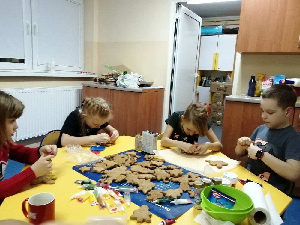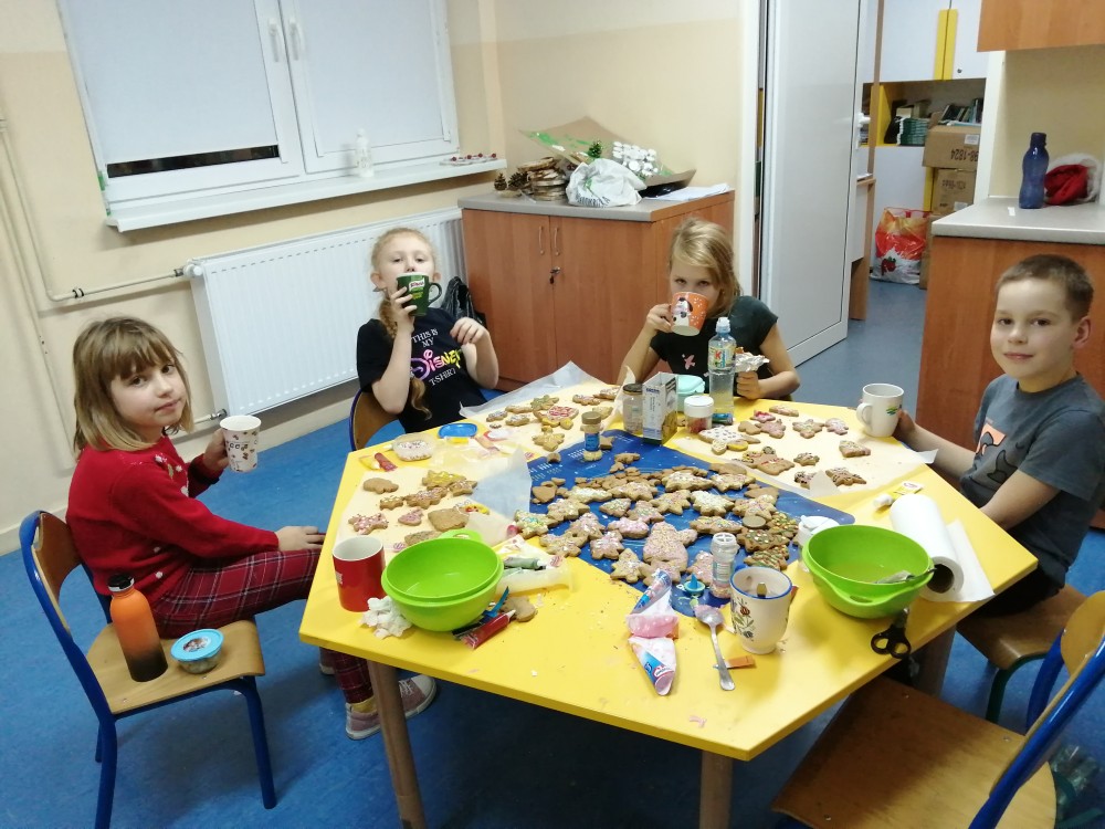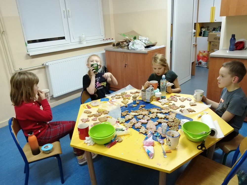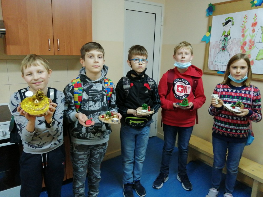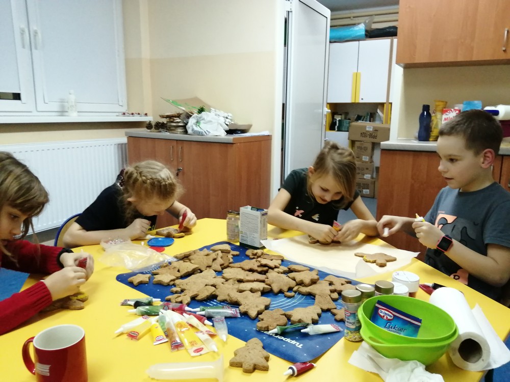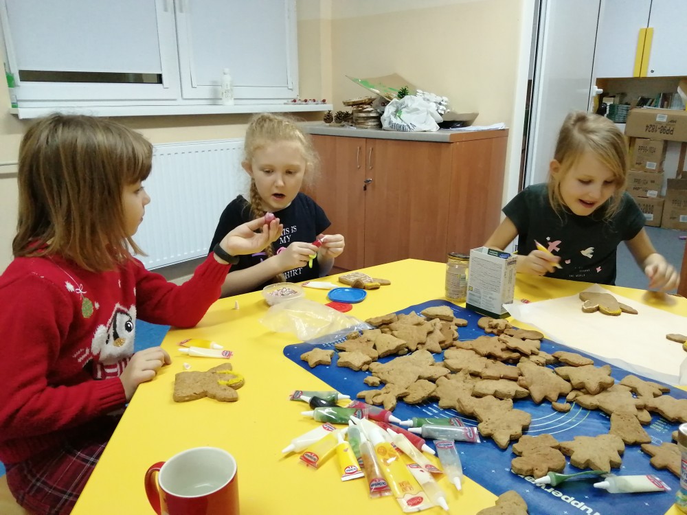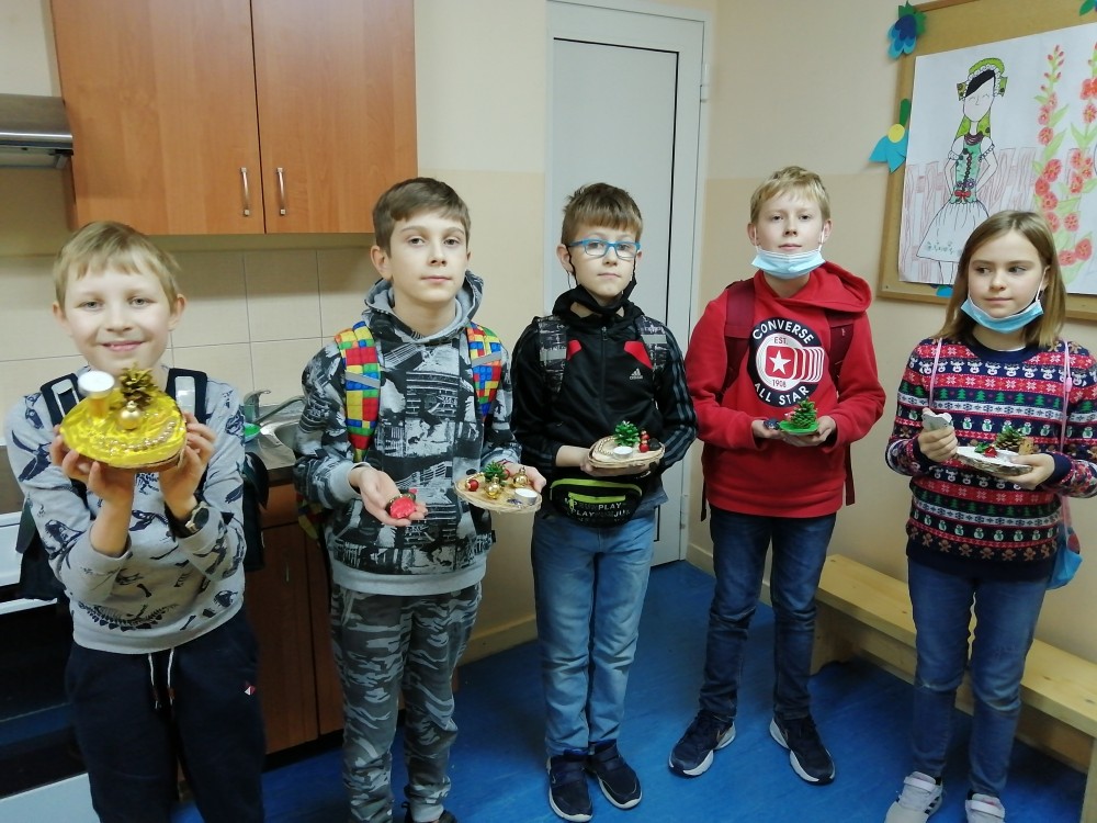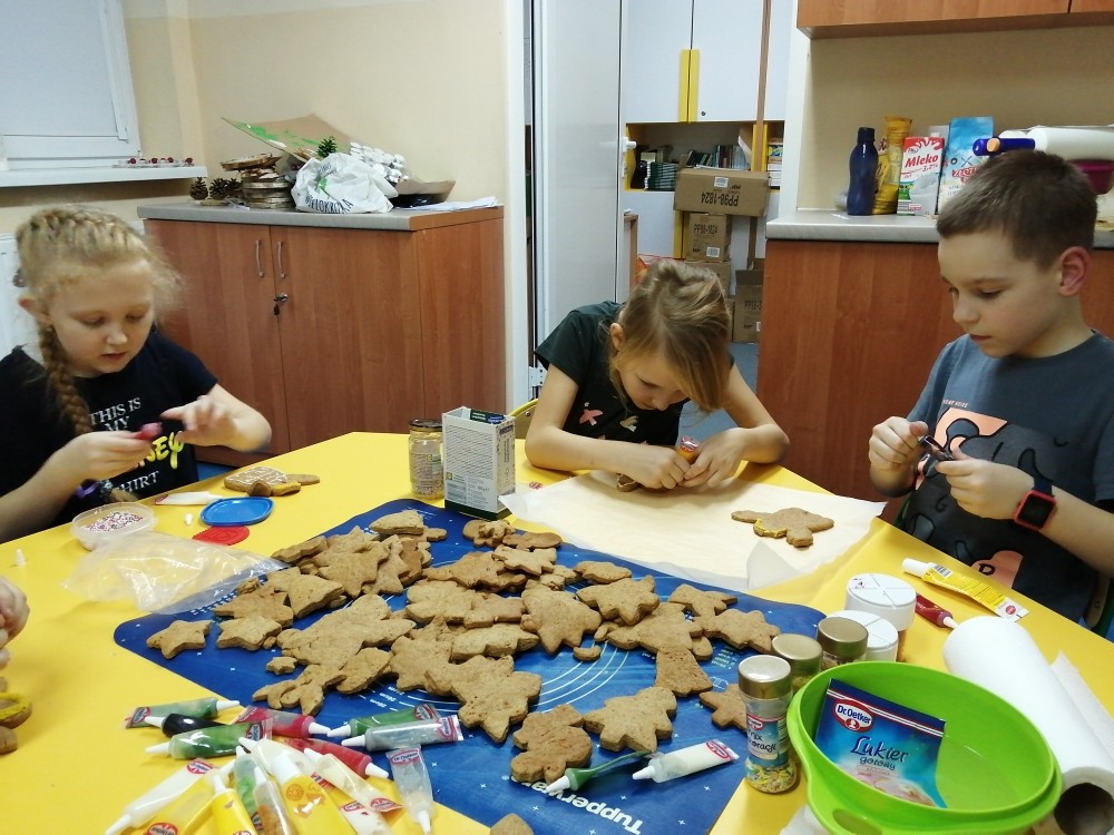Dzieci w ramach zajęć z języka kaszubskiego w grudniu 2021r nocowały w szkole i poznawały kolejne tajniki kaszubskiej kuchni. Tym razem poznały recepturę na pierniki. Uczniowie samodzielnie wykonali ciasto, wyrobili je, wykrawali i zdobili. Pierniczki były przepyszne i wszystkim bardzo smakowały. Wykonaliśmy je z myślą o kiermaszu bożonarodzeniowym, w który się włączyliśmy. Nocowanie w szkole zawsze dzieciom sprawiają wiele radości. Na kiermasz również wykonaliśmy stroiki(świeczniki) na świąteczny stół.