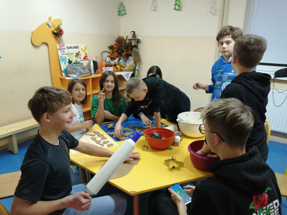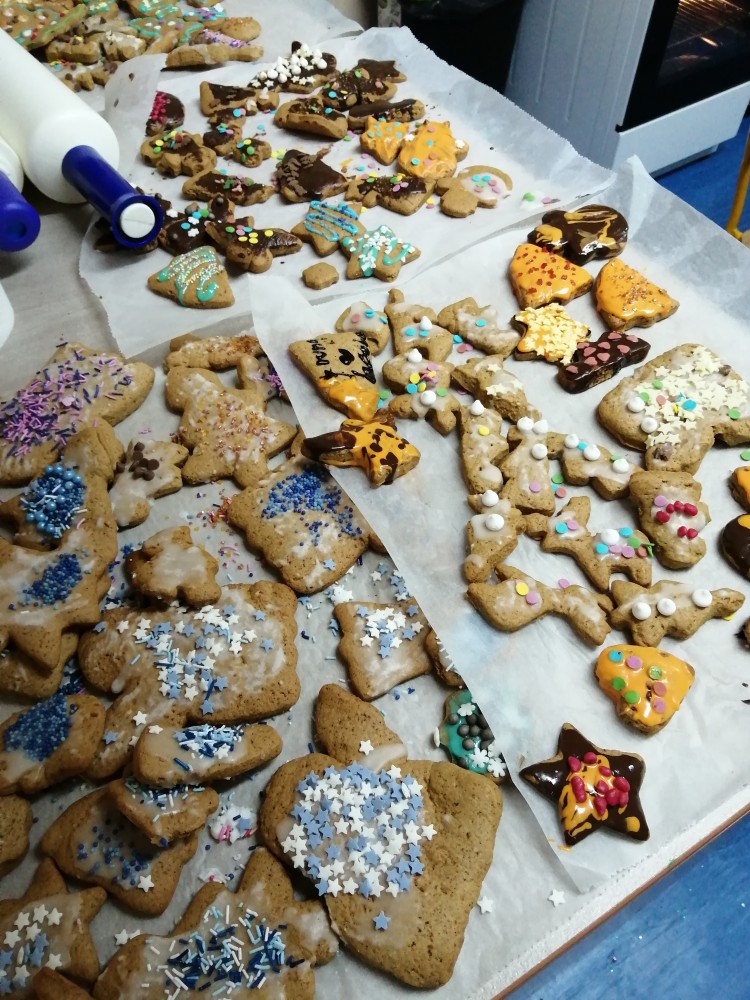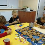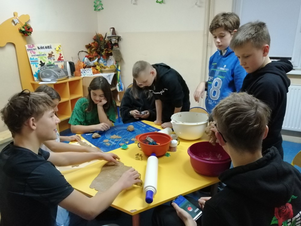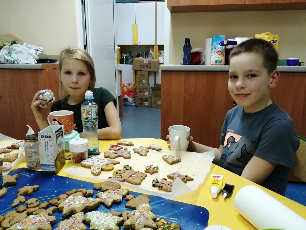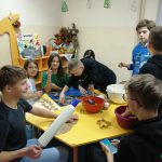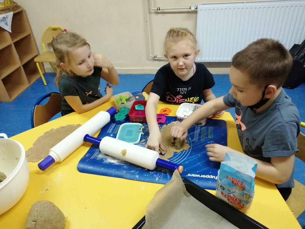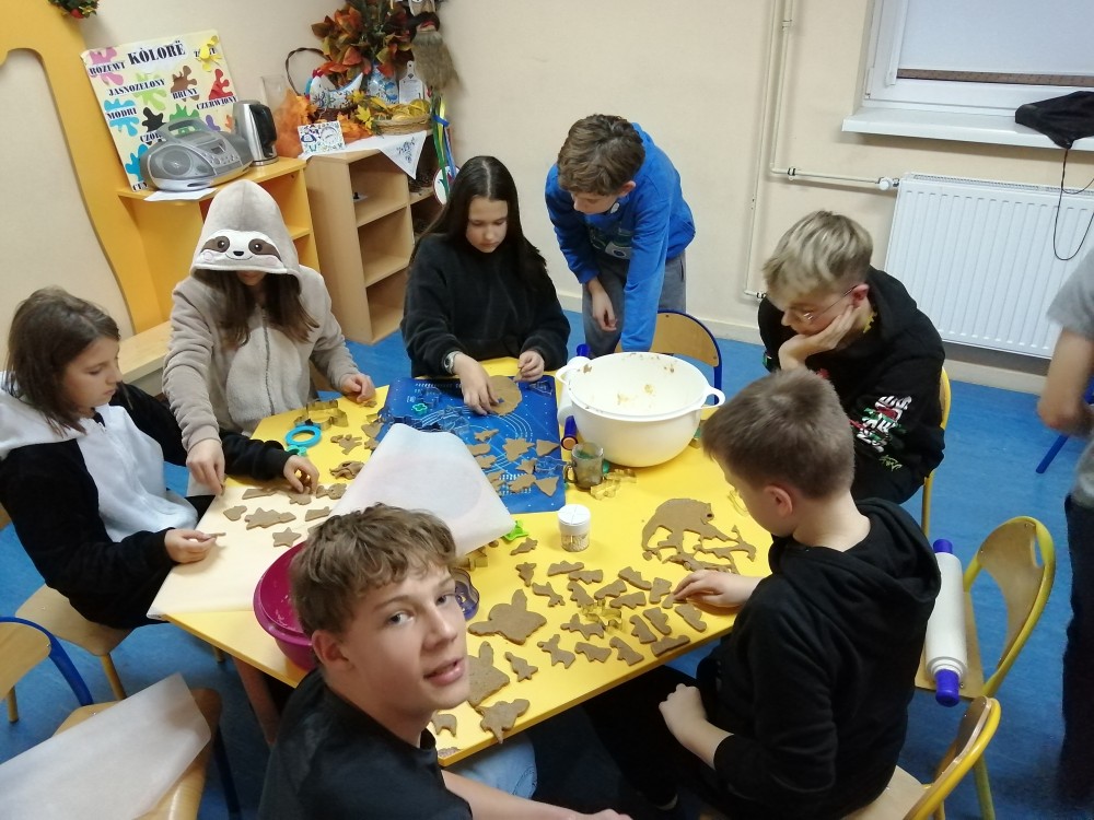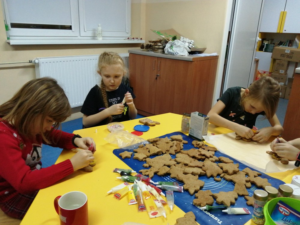 Dzieci w ramach zajęć z języka kaszubskiego w grudniu 2021r nocowały w szkole i poznawały kolejne tajniki kaszubskiej kuchni. Tym razem poznały recepturę na pierniki. Uczniowie samodzielnie wykonali ciasto, wyrobili je, wykrawali i zdobili. Pierniczki były przepyszne i wszystkim bardzo smakowały. Wykonaliśmy je z myślą o kiermaszu bożonarodzeniowym, w który się włączyliśmy. Nocowanie w szkole zawsze dzieciom sprawiają wiele radości. Na kiermasz również wykonaliśmy stroiki(świeczniki) na świąteczny stół.
