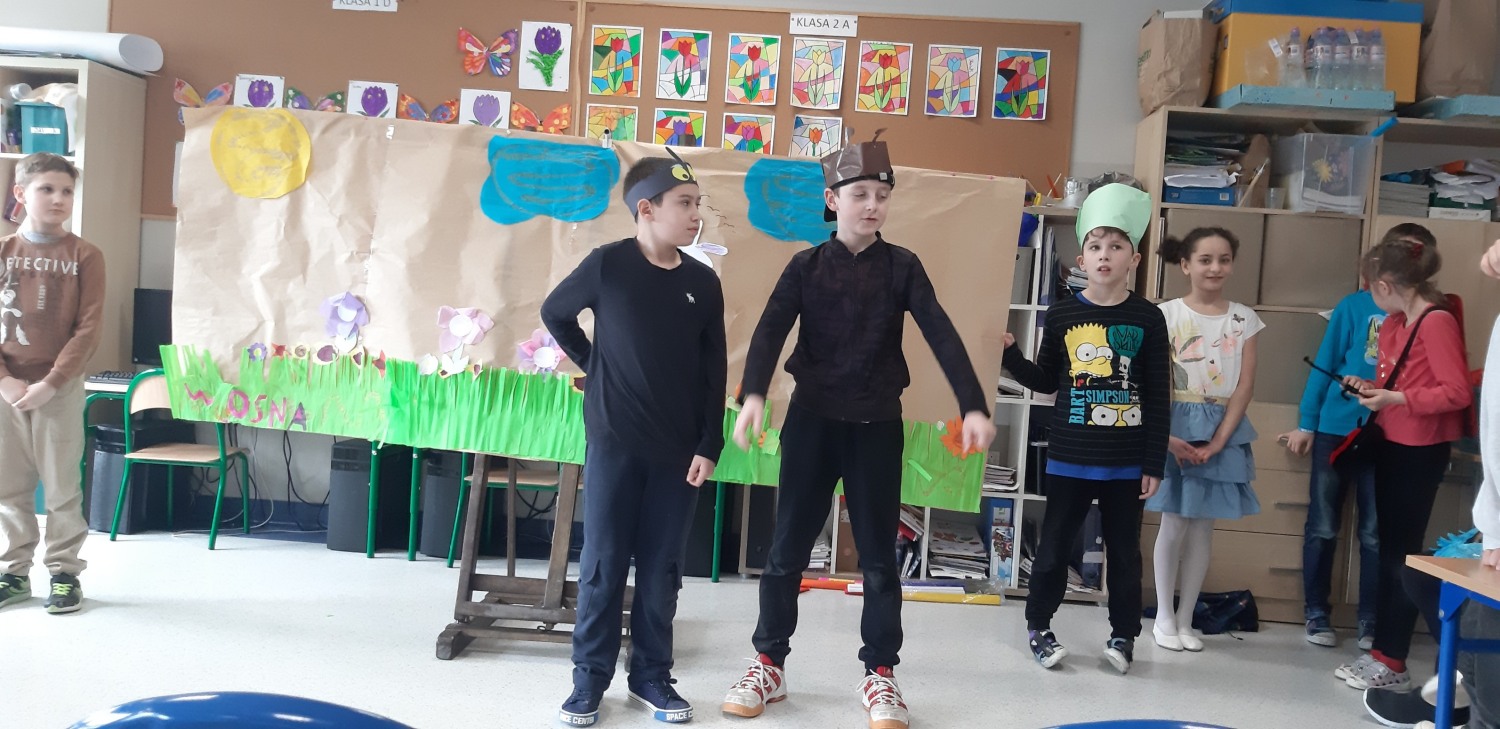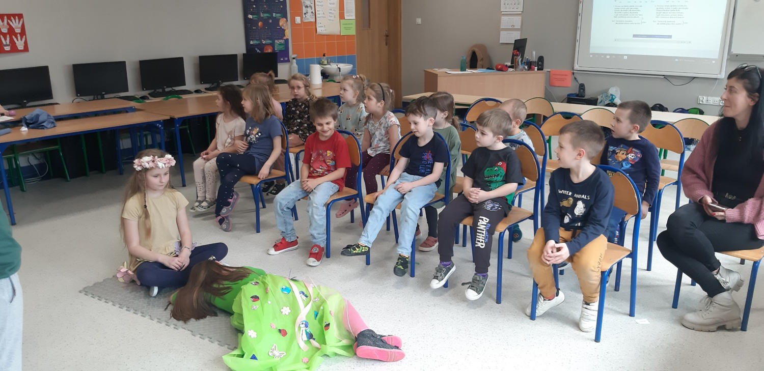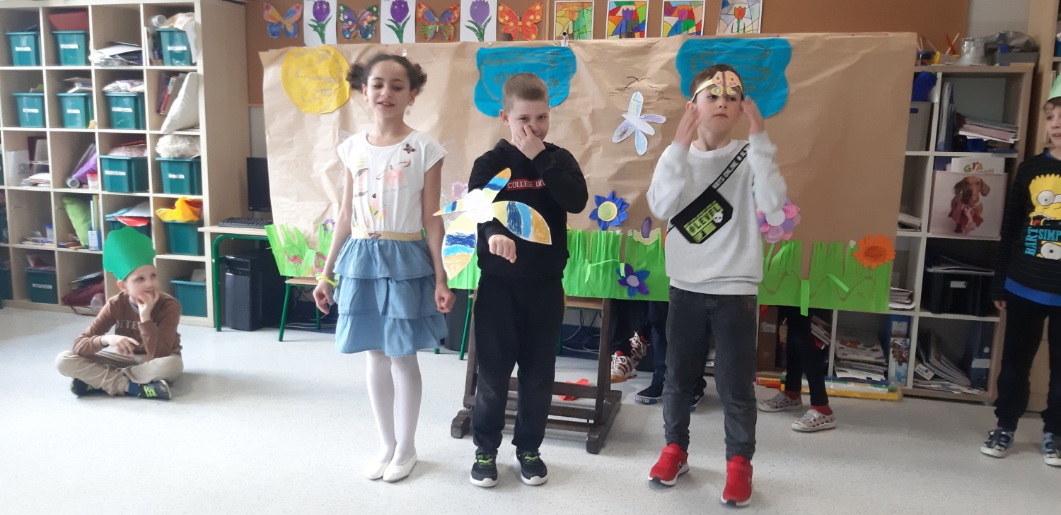 31 marca 2023 r. był dla klasy IIa dniem szczególnie radosnym. Oto w naszej sali pojawili się wyjątkowi goście – wychowankowie Przedszkola z grupy 0c. Przybyli na nasze zaproszenie. Przygotowaliśmy dla nich przedstawienie pt. „Witaj wiosno”. Podczas występu uczniowie wcielili się w różne role: bociana, muchy, pszczoły, przyrody, jaskółeczki, motyla, mrówki pani wiosny i przyrody.