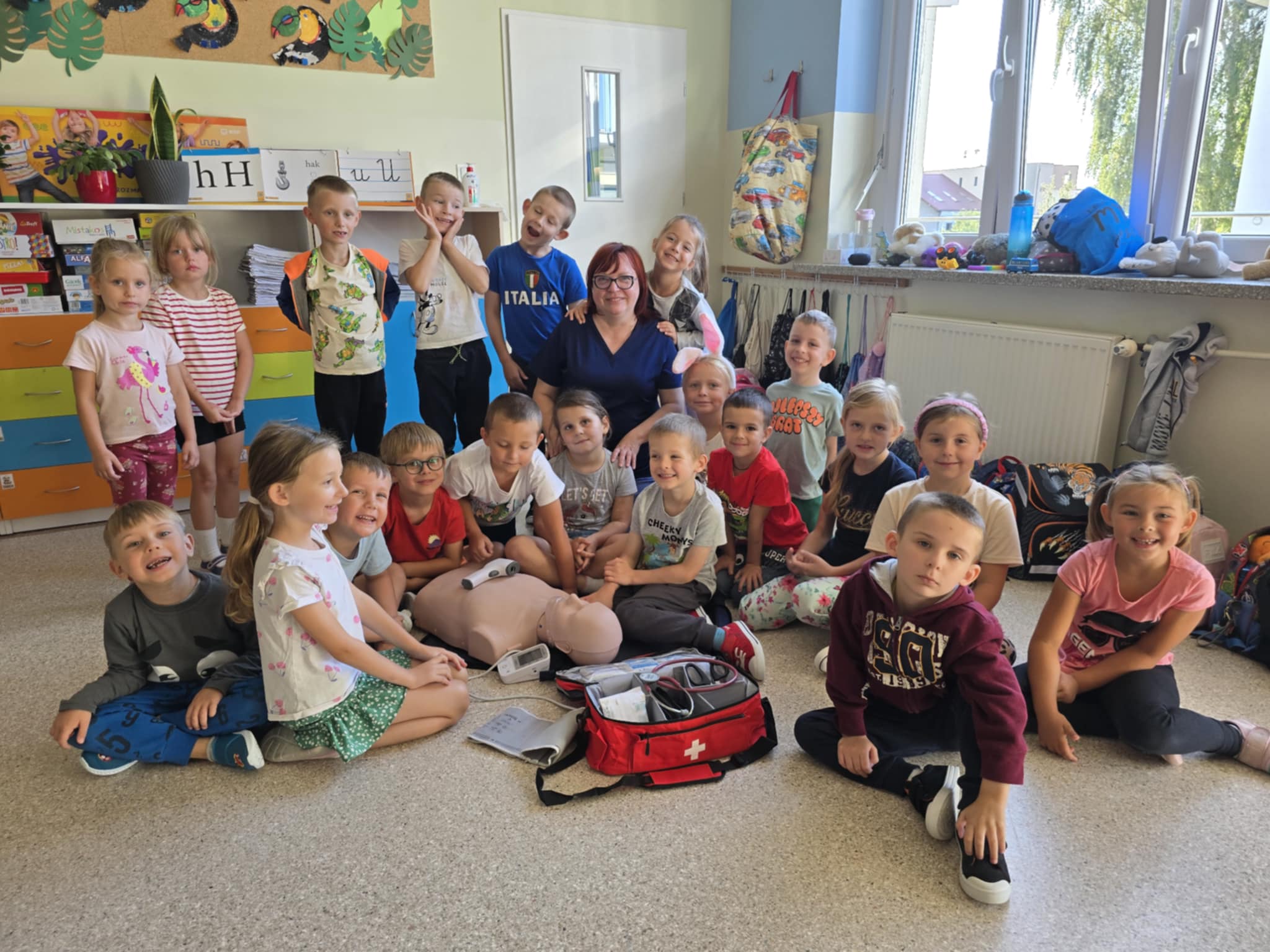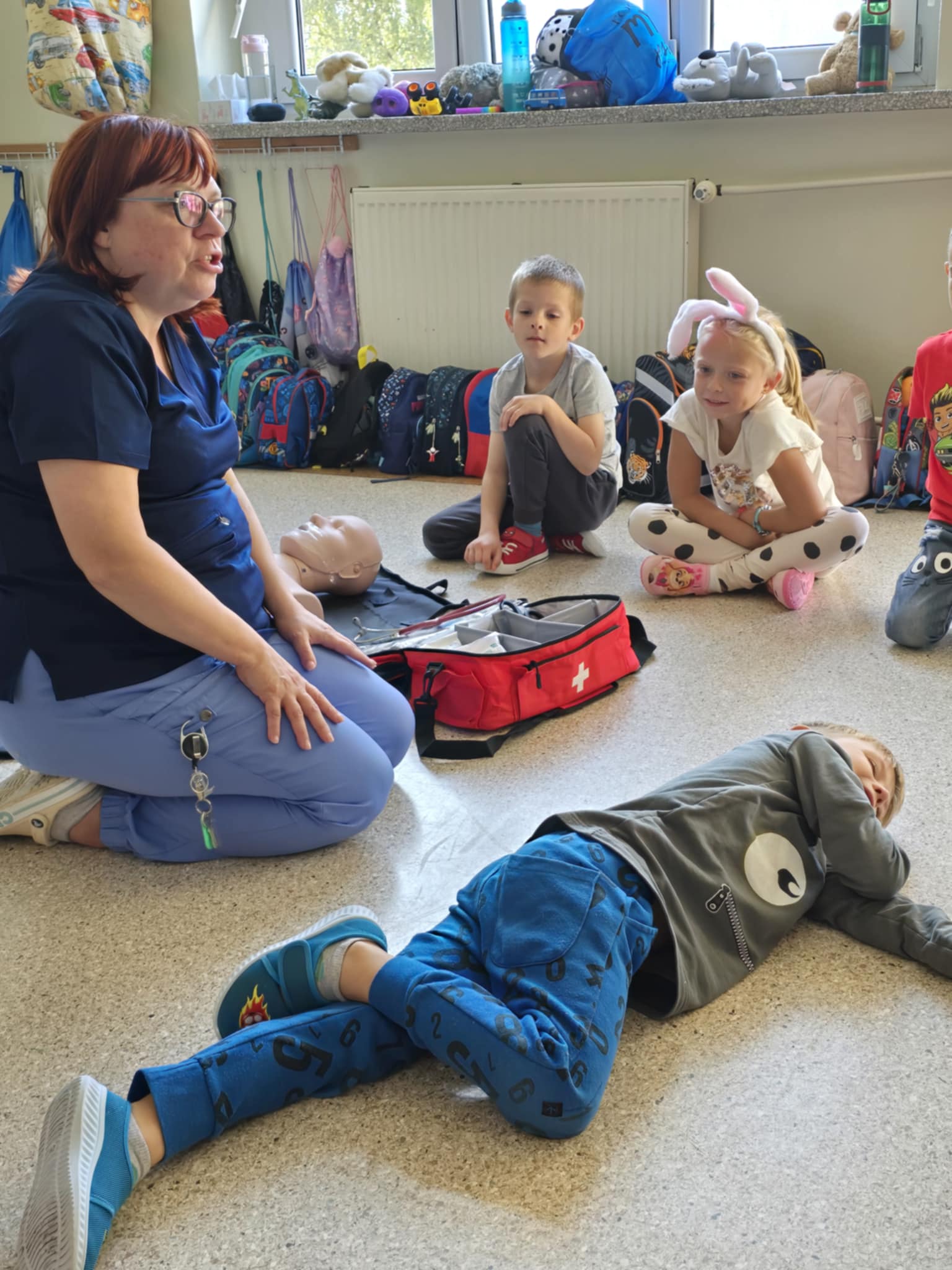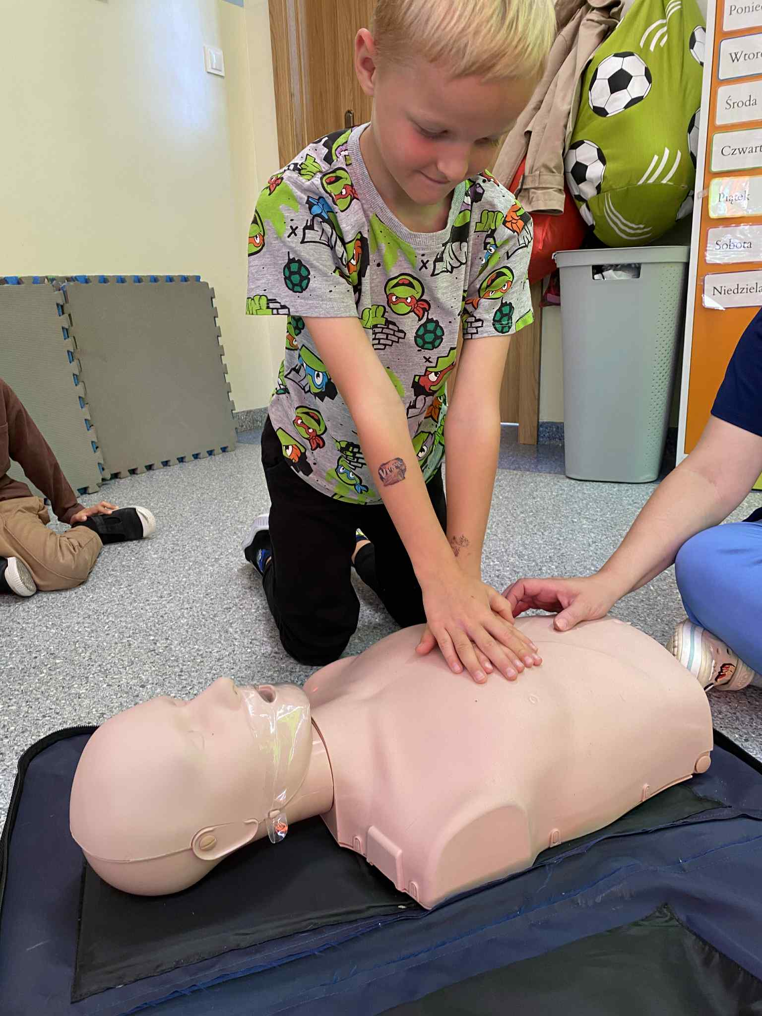 Dzieci przypomniały sobie numery alarmowe, ćwiczyły rozmowę z dyspozytorem, poznały zawartość apteczki, nauczyły się układać dłonie w sposób umożliwiający dobry ucisk klatki piersiowej, próbowały swoich sił w RKO. Słuchały bicia swojego serca i to wzbudziło najwięcej emocji 😊 To były bardzo ważne zajęcia.