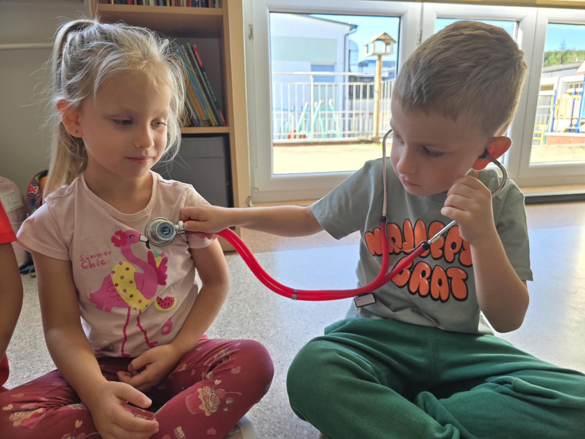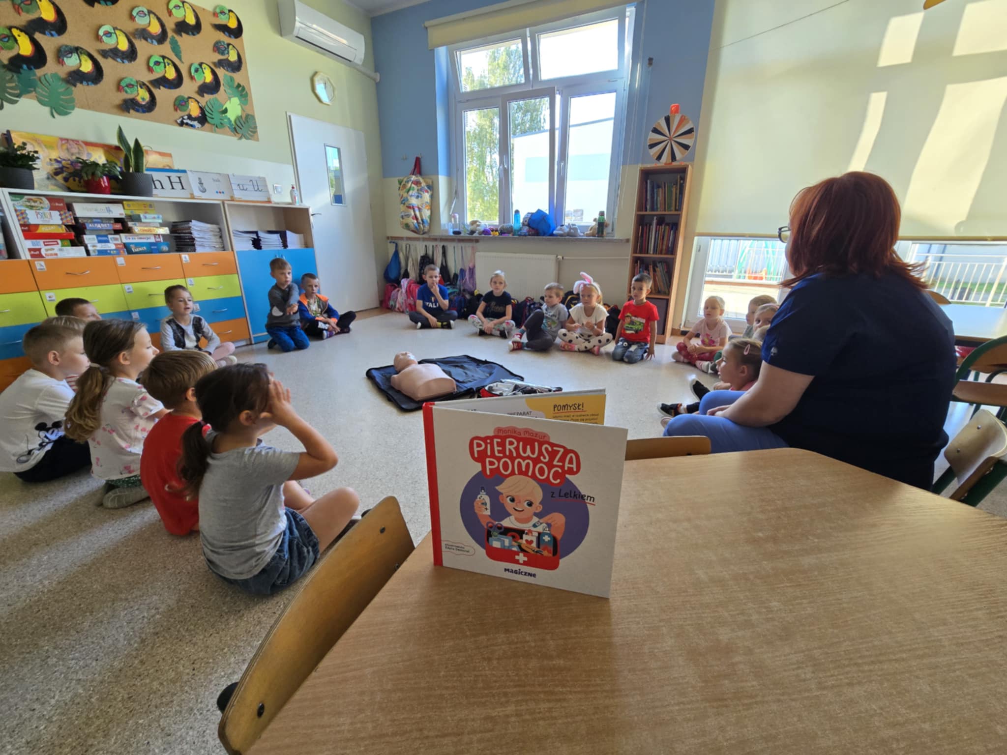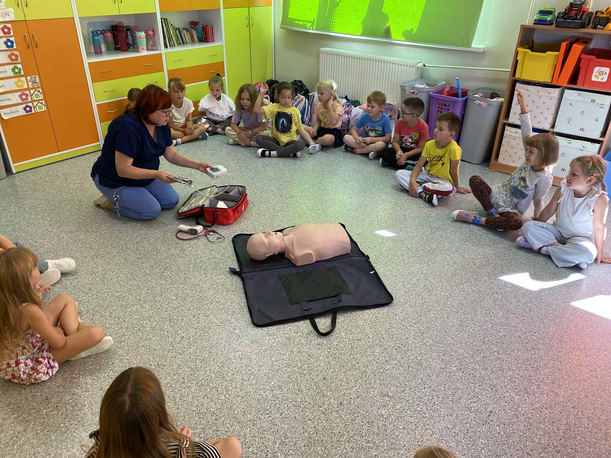 Dzieci przypomniały sobie numery alarmowe, ćwiczyły rozmowę z dyspozytorem, poznały zawartość apteczki, nauczyły się układać dłonie w sposób umożliwiający dobry ucisk klatki piersiowej, próbowały swoich sił w RKO. Słuchały bicia swojego serca i to wzbudziło najwięcej emocji 😊 To były bardzo ważne zajęcia.