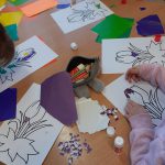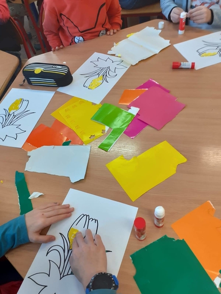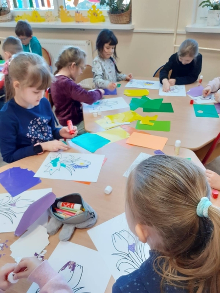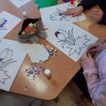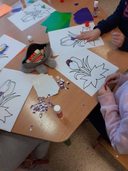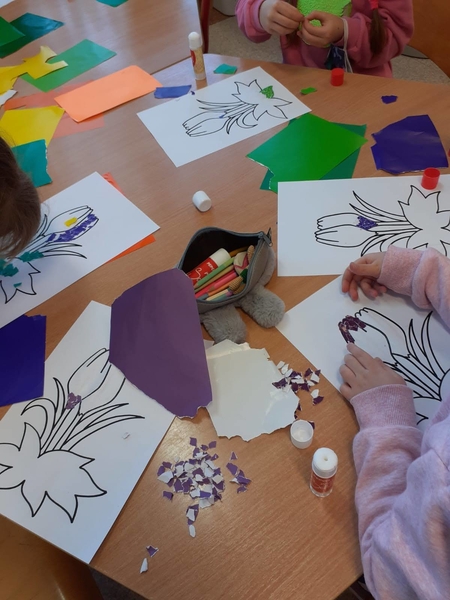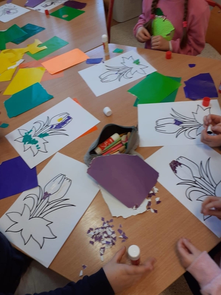 Rozmawialiśmy też o przedwiośniu. Pytań było dużo, a wyczerpujących odpowiedzi jeszcze więcej. Nauczyliśmy się śpiewać piosenkę „ Już ozimina…” oraz wykonaliśmy prace plastyczne. Była to wydzieranka – krokusy, która dostarczyła dzieciom dużo zadowolenia.