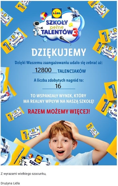 Dzięki zaangażowaniu całej społeczności szkolnej udało się zebrać 12800 Talenciaków, które zostały wymienione m. in. na szafki z klockami, tor do balansowania, zestaw chust do żonglowania, łapacze na rzepy, piłki do siatkówki, zestawy do nauki ułamków, matematyczny twister oraz emocjomierz.