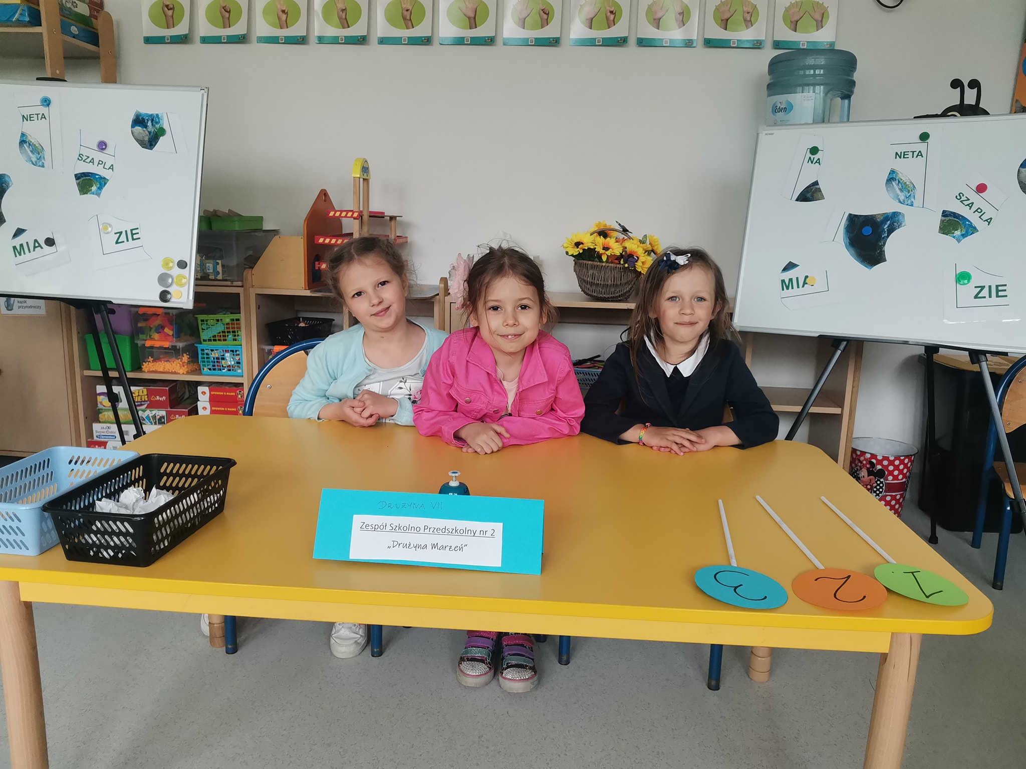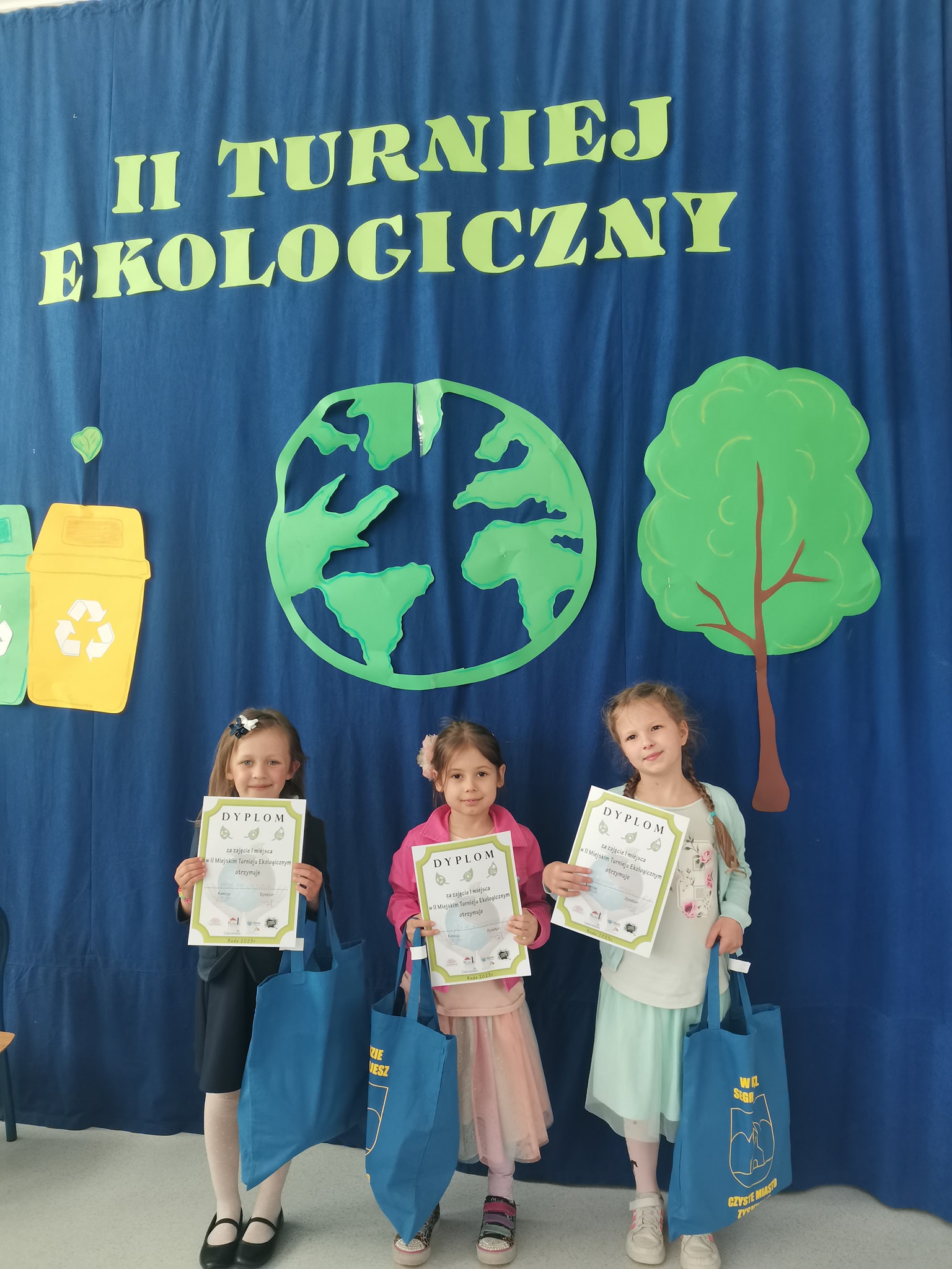 Dzieci układały puzzle, budowały najwyższe wieże z opakowań i pudełek, odpowiadały na pytania m.in. o odnawialne źródła energii, segregowały śmieci itp. Kolejne konkurencje, w których doskonale radziły sobie wszystkie dzieci i punkty zdobywane za ich wykonanie, po podliczeniu wyłoniły zwycięzców. Wygrała „Drużyna marzeń” z naszego oddziału przedszkolnego. Jesteśmy dumne, że nasze uczennice tak dużo wiedzą o ochronie Ziemi i co najważniejsze- tę wiedzę przenoszą na codzienne zachowania. To niezwykle udany debiut w Miejskim Turnieju Ekologicznym.