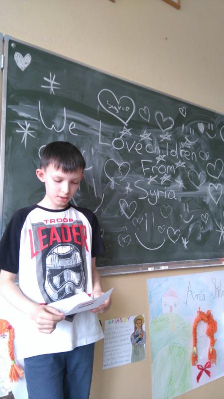 W tym celu, w czasie kilku spotkań, przygotowali i zaprezentowali referaty oraz plakaty o aktualnej sytuacji politycznej w Syrii, a także napisali listy ze słowami otuchy i wsparcia dla dzieci syryjskich. Korespondencja ta została przetłumaczona na język angielski i wysłana na adres Polskiej Akcji Humanitarnej. Koordynatorem szkolnego przedsięwzięcia „Dzieci dla Dzieci” była pani Izabela Dąbrowska.