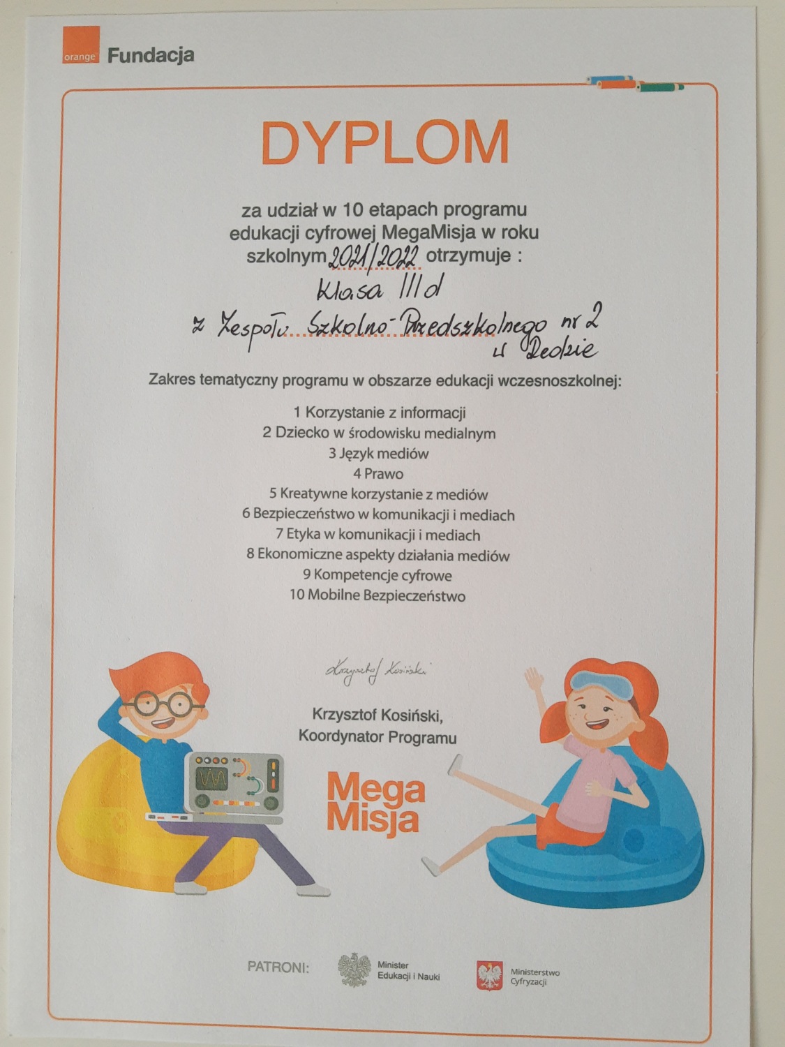 Program MegaMisja realizowany od początku września dobiegł końca. Uczniowie klasy IIId oraz wirtualni bliźniacy Julka i Kuba naprawili to, co Psotnik popsuł przemierzając wszystkie pokoje Cyfrowego Laboratorium.